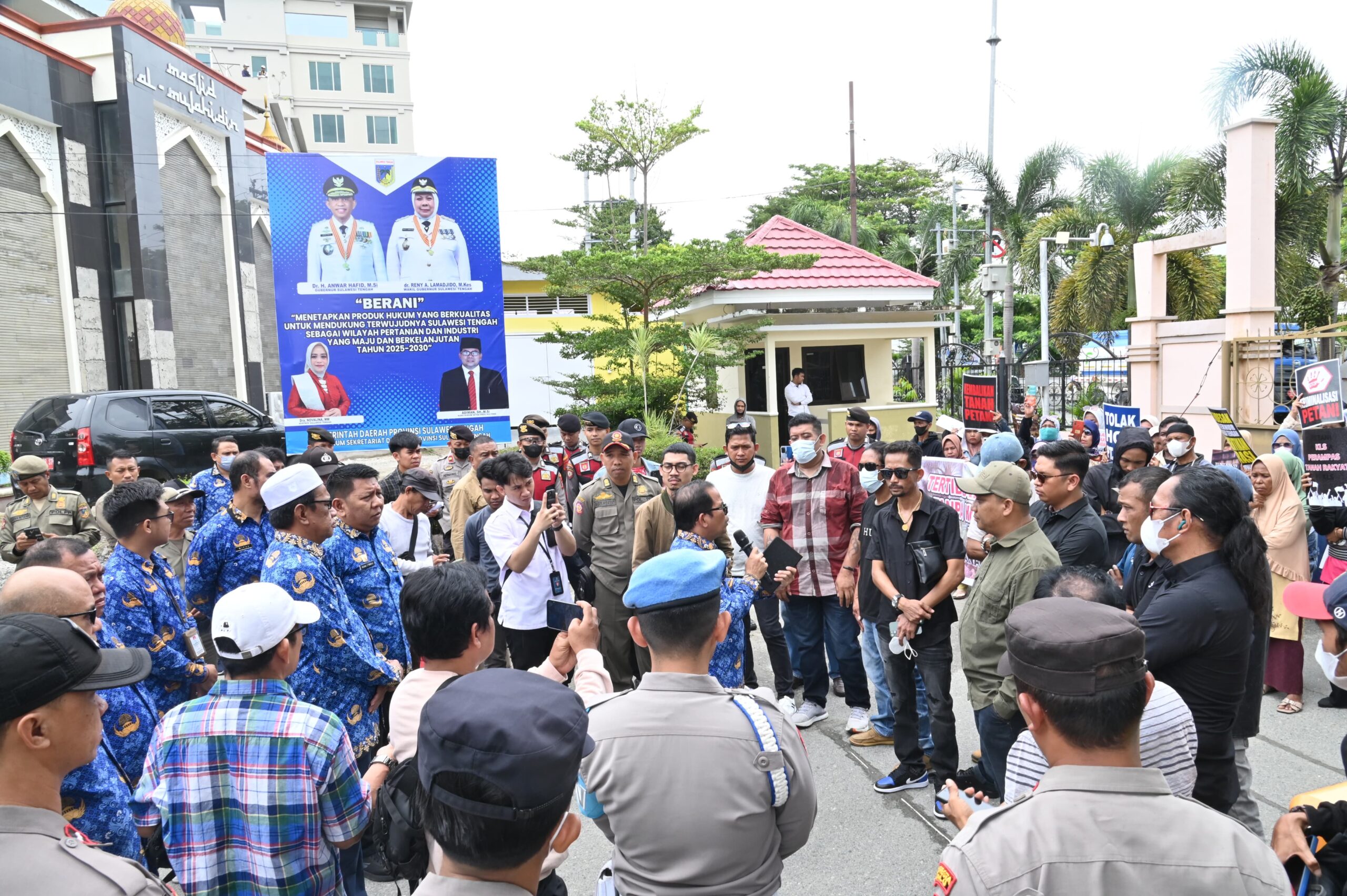 Antasena (deadlinews.co) – Palu – Gubernur Sulawesi Tengah (Sulteng), Dr. H. Anwar Hafid, MSi melalui kepala Biro Hukum Adiman, SH.MH menemui massa aksi unjuk rasa di depan Kantor Gubernur Sulawesi Tengah Jalan Sam Ratulangi, pada Senin (17/3/2025).