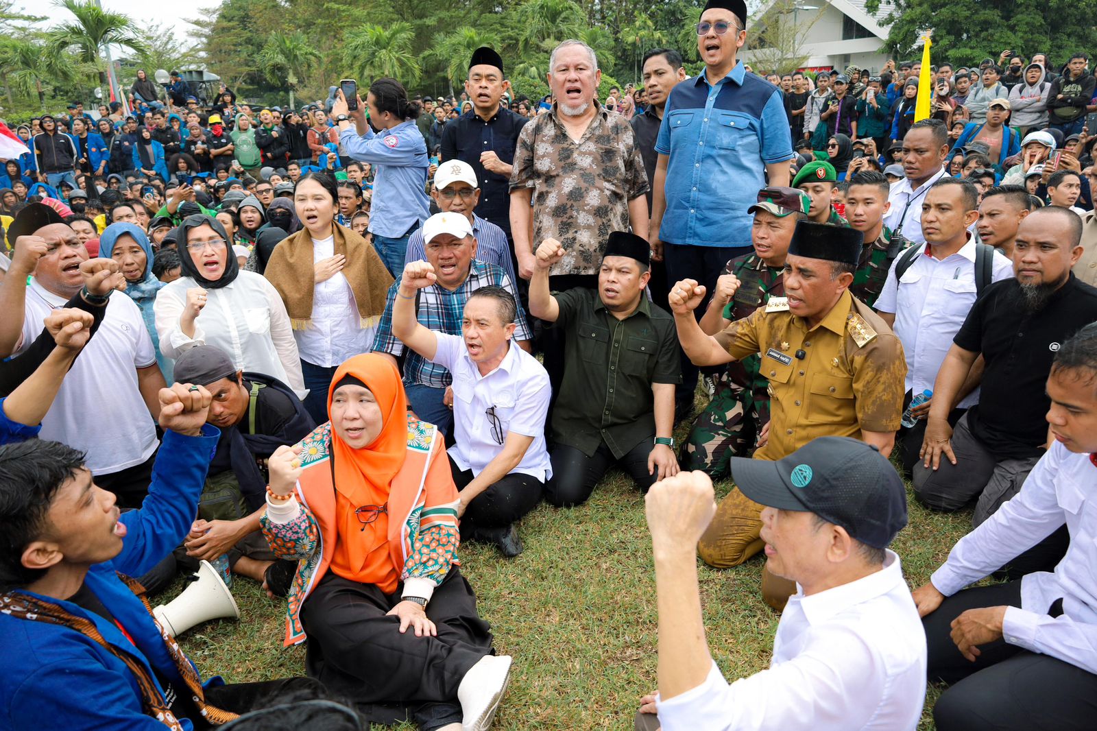 Antasena (deadlinews.co) – Palu – Gubernur Sulawesi Tengah, Dr. H. Anwar Hafid, M.Si., bersama ribuan massa aksi duduk bersama di depan Kantor DPRD Sulteng, Senin (1/9/2025). Aksi yang digelar di tengah rintik hujan itu berlangsung tertib dan dihadiri sejumlah pejabat daerah.