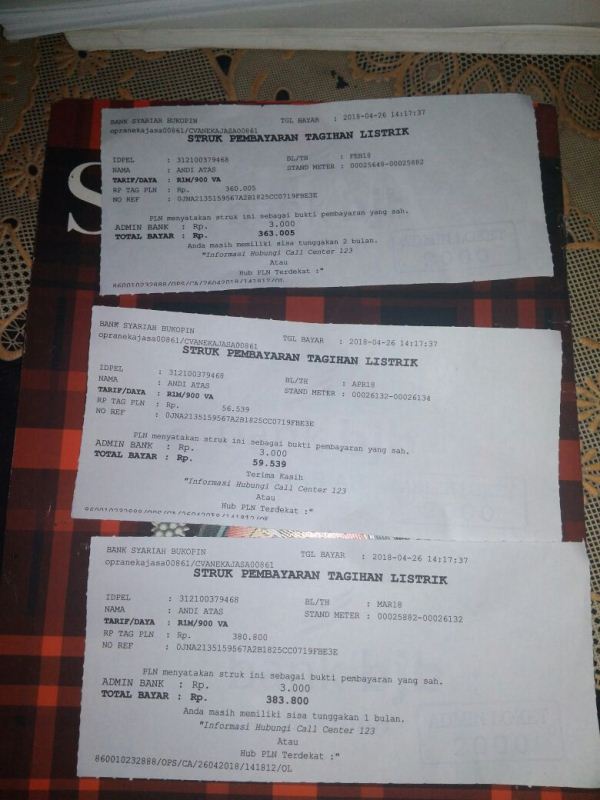 Ironisnya lagi sampai di PLN rayon kota Palu jalan Sulawesi diminta bayaran lagi Rp.350 ribu yang katanya untuk pembayaran pemakaian bulan April yang biasanya dan mestinya dibayar pertanggal 15 Mei 2018 mendatang. Tapi kok ini harus bayar duluan baru pasang meteran prarbayar dengan daya yang sama. Dengan demikian total bayarnya mencapai Rp,1.150,000.
