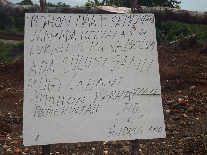 Pantauan deadline-news.com Selasa (25/4-2018) di lokasi TPA itu memang tak Nampak aktifitas. Dan didepan pintu masuk dan keluar terdapat karton bertuliskan “Mohon Maaf sementar jangan ada kegiatan di lokasi TPA sebelum ada sulusi ganti rugi lahan: mohon perhatian pemerintah”. Dan tulisan di karton itu dibubuhi ditanda tangani oleh H.Idrus Amu.